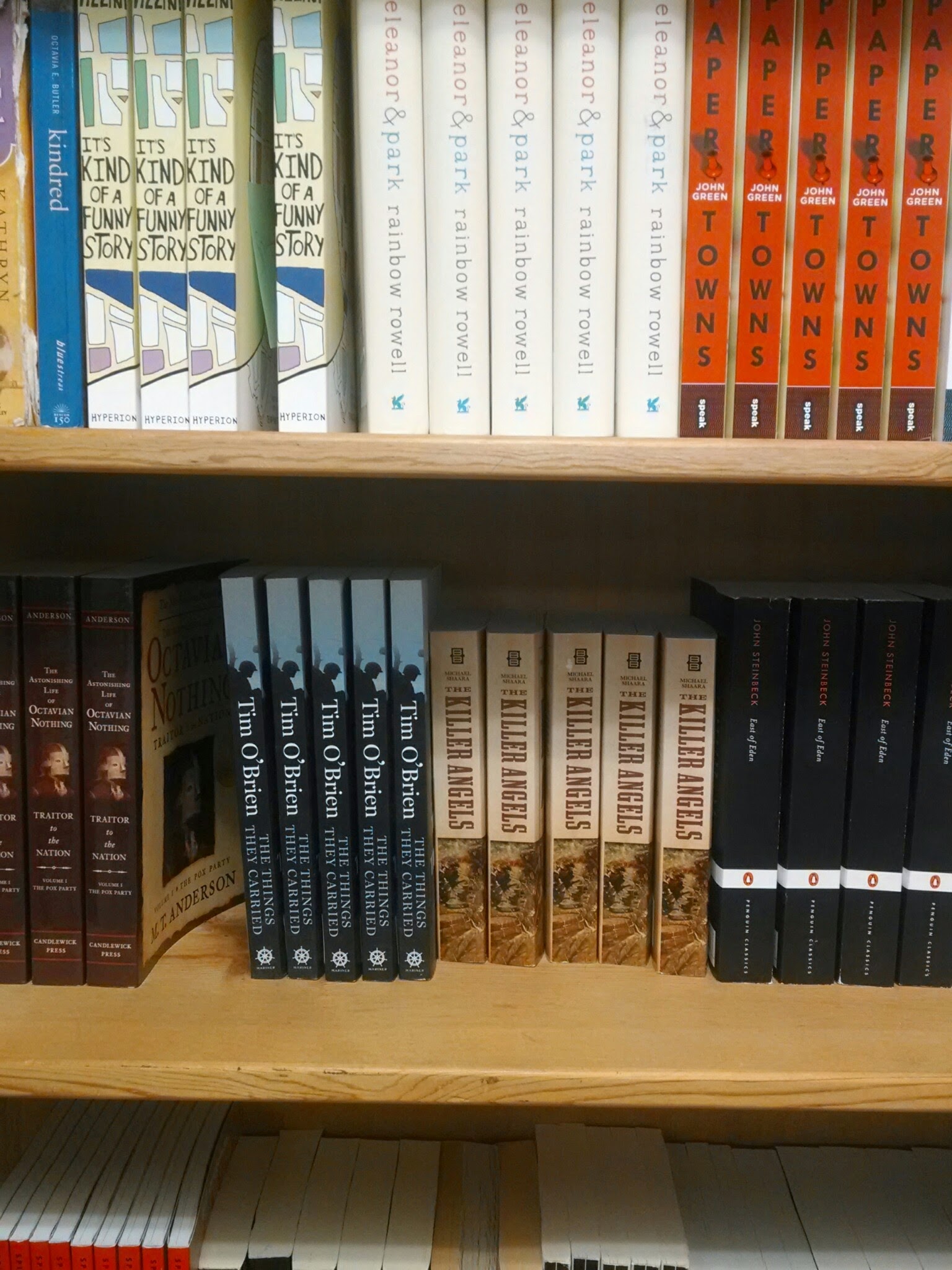 Multiple copies of fewer titles, on the other hand, make a classroom library resemble a Barnes and Noble bookstore. Books pop, whether you stack them spine-out or cover-out. The bookshelves are beautiful, and if you’re a student, you’re lured to check out all that color and pick up a book.