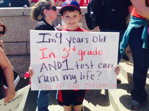 It just doesn’t make sense to argue that your 9-year-old boy is a robot of standardized testing and then force him to a protest with a sign that you made yourself.